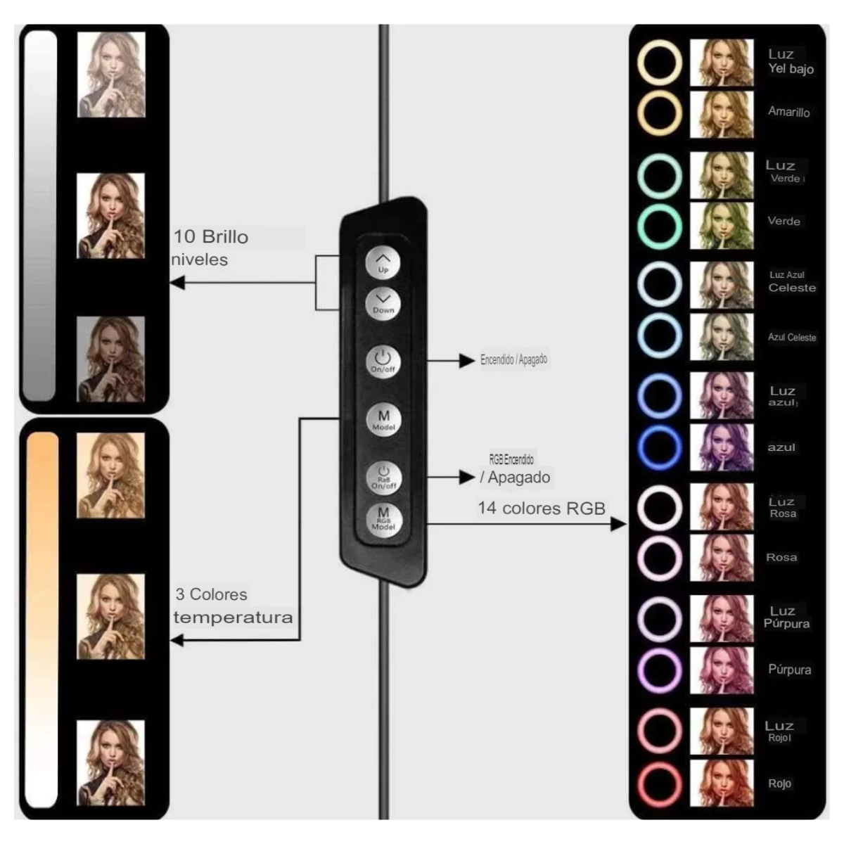 Ilumina tu creatividad con nuestro Aro de Luz LED 45 cm Trípode 2.1 M. Eleva la calidad de tus fotos y videos, diseñado para creadores, este anillo te ofrece una iluminación versátil como ajustable que transformará tu espacio de trabajo en un estudio profesional. - Iluminación RGB: Adapta la iluminación a tu estilo con opciones RGB. Crea ambientes únicos para cada proyecto, desde tonos cálidos hasta colores vibrantes, con un simple ajuste. - Brillo Ajustable: Controla la intensidad de la luz según tus necesidades. Desde una luz suave para maquillaje hasta una iluminación brillante para fotografía, encuentra el brillo perfecto con facilidad.- Ideal para Fotografía: Obtén una iluminación uniforme, sin sombras para resaltar detalles. - Soporte Universal: Compatible con cualquier dispositivo de montaje, este anillo de luz se adapta a trípodes y soportes para ofrecerte la mejor perspectiva. Ajusta el ángulo según tus necesidades.- Control Remoto: Incluye un control remoto para ajustar el color, brillo y modo de iluminación sin tener que interrumpir tu sesión. Facilita tu flujo de trabajo.
