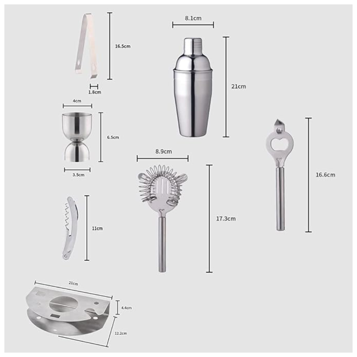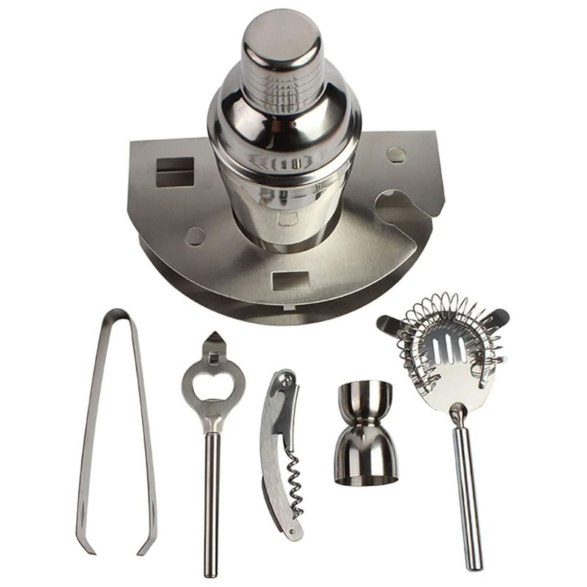Este Juego de Coctelera 7 Piezas Deluxe viene con todo lo necesario como la coctelera, sacacorchos, un práctico cuchillo de camarero, colador, pinzas para hielo, vaso medidor y hasta un elegante soporte de acero inoxidable. Perfecto para tener en casa, para un bar o como un regalo genial. - Todo en Uno: Este set trae todas las herramientas básicas para preparar cócteles increíbles. Desde la coctelera hasta el medidor, no falta de nada. - Coctelera con Estilo: La coctelera es de acero inoxidable pulido, con un acabado espejo que encanta. Además, está diseñada para que al servir no se cuelen trocitos de hielo, menta, semillas de limón, nada que estropee tu bebida. - Imprescindible: Este kit es una joya, tanto si eres un profesional como si te estás iniciando en el mundo de los cócteles y las bebidas frías. Olvídate de remover en un vaso cualquiera, con esta coctelera conseguirás el frío perfecto para tus mezclas. - El Regalo Perfecto: Ideal para preparar desde los cócteles más clásicos hasta tus propias creaciones. Su diseño sencillo y elegante le da un toque moderno a cualquier rincón de bar en casa. - Tranquilidad Garantizada: Los materiales de alta calidad junto al diseño resistente, te garantía una durabilidad en el tiempo.